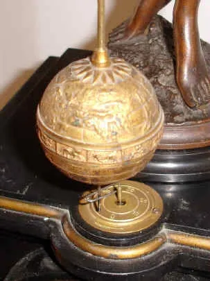 C.1880, French, Conical Pendulum Clock, the base of bronze and Belgian black slate, and the angel statue of patinated spelter, holding a detailed cast and gilded globe as the pendulum, signs of the Zodiac around the equator. Condition: the index finger of the Angel has been broken away for a long time; only visible on close inspection. The original arrow to drive the pendulum has been replaced with a wire; works fine. Otherwise, in very good original condition. Ht 25"