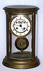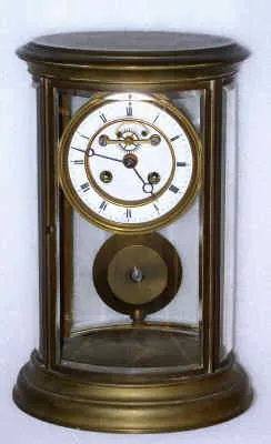 C.1900, French, OVAL 4-GLASS, or crystal regulator with open escapement and bell strike. Condition: winding grommets are absent, otherwise the clock is in overall very good original condition. Porcelain dial is good, Breguet style hands original, bell original. There is no signature or trademark on the movement. Pendulum with oval polished rod is original and fits wide slot in crutch. From storage, case is tarnished and movt needs service; no rust. Ht 11.5"