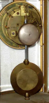 Condition: winding grommets are absent, otherwise the clock is in overall very good original condition. Porcelain dial is good, Breguet style hands original, bell original. There is no signature or trademark on the movement. Pendulum with oval polished rod is original and fits wide slot in crutch. From storage, case is tarnished and movt needs service; no rust. Ht 11.5"
