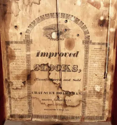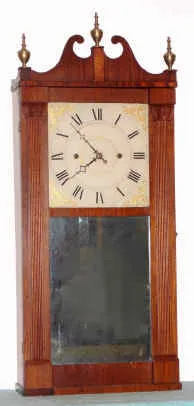 C.1830, Chauncey Boardman, Bristol, Conn., 30-hour wood movement reeded pilaster and scroll top shelf clock. Condition: Mahogany veneered case with some minor veneer repairs on the base and the door. Top /scrolls have been replaced, though nicely done.. Very clean dial. Brass finials are modern. Typical groaner movement. Would be $1000 with old scrolls. Ht. 36"