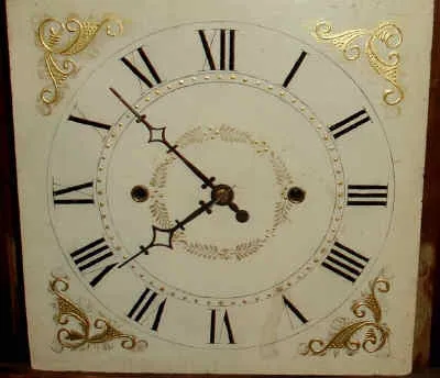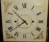 Condition: Mahogany veneered case with some minor veneer repairs on the base and the door. Top /scrolls have been replaced, though nicely done.. Very clean dial. Brass finials are modern. Typical groaner movement. Would be $1000 with old scrolls. Ht. 36"