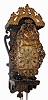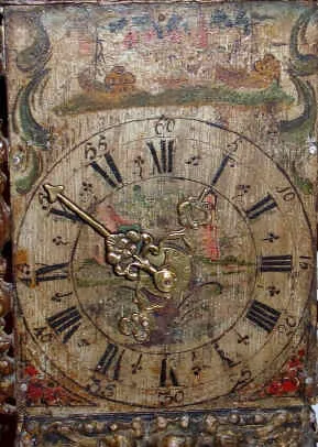 C.1790, Dutch, Stoelklok, time and strike wall clock, with early 'pot handle' ears, weight driven, one day. Condition: dust cover for rear of movement is absent; alarm is absent, otherwise clock is in excellent restored condition, just professionally cleaned and running and striking briskly. All of the original lead trim is intact and the dial is original; rose decorations on wooden stand are restored. Ht 28"