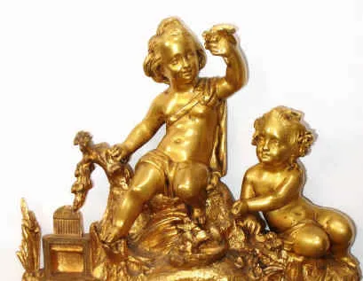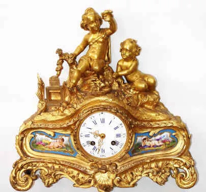 C.1875, French, Ormolu Figural clock, PLAYING CHILDREN, showing a young boy and girl in the woods with a bird nest, holding one chick aloft and with an open bird cage to one side, ready to receive the new pet. Condition: there is wear to the gilding on high spots, but overall, the case is in very good original condition. The porcelain dial has a repaired chip near 8 that has turned dark. The hand painted porcelain plaques are excellent. Fancy tooled hands are original. Ht 13"