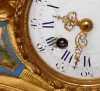 Condition: there is wear to the gilding on high spots, but overall, the case is in very good original condition. The porcelain dial has a repaired chip near 8 that has turned dark. The hand painted porcelain plaques are excellent. Fancy tooled hands are original. Ht 13"