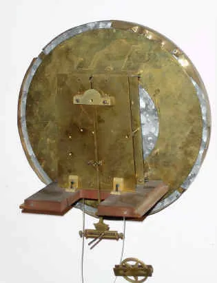 Condition: painted dial, tinned dial plate and bezel are all replacements and not well done. The verge is from another old Vienna, moved lower into the movement to function; clock does run. The walnut veneered case has some splits in the veneer, but is generally good; there is a fretted mask in the center of the case back. Movement and slide and mounts are original to the case, as is beat scale. Pend stick is a replacement, and is flat front and rear. In pristine condition this clock would be worth several thousand dollars, and it is difficult to estimate in this condition. Ht 56"