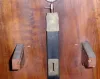 C.1900, Austrian, 90-Day Vienna timepiece, single weight, with center seconds hand. Condition: painted dial, tinned dial plate and bezel are all replacements and not well done. The verge is from another old Vienna, moved lower into the movement to function; clock does run. The walnut veneered case has some splits in the veneer, but is generally good; there is a fretted mask in the center of the case back. Movement and slide and mounts are original to the case, as is beat scale. Pend stick is a replacement, and is flat front and rear. In pristine condition this clock would be worth several thousand dollars, and it is difficult to estimate in this condition. Ht 56"