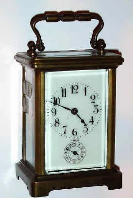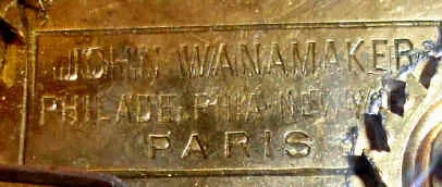 C.1900, French, Brass Cased Carriage clock, time and alarm, made for and sold by John Wanamaker, Philada, NY and Paris, and so marked on rear plate. Condition: although the original lever platform is intact, every pane of glass has chip[s], and the rear door needs a pin, currently taped into place. Ticks for a while. Dial is perfect, hands original. Ht 5.7"