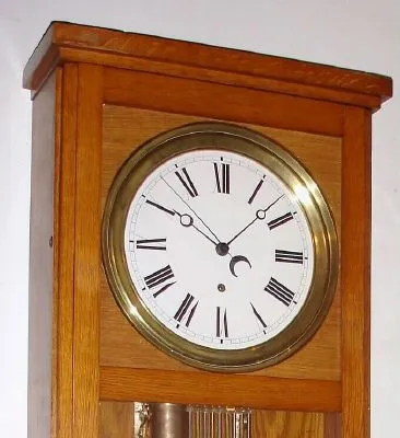 A Swiss or French pinwheel movement with porcelain dial and center seconds, now in an American oak case, probably from a self winding school unit, with grid/lyre pendulum, 8-day. C.1900.