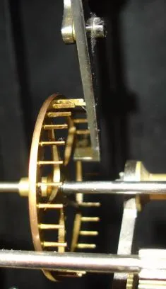 the movement is setting loose on a shelf screwed to new metal corbels in the case, and is sensitive to position for the door to close. The minute and hour hands are original, but are lacking their chamfered retaining washers (relatively easy to make); seconds hand has been made from a calendar hand, however proper replacements are available from Timesavers. There is a recess on top of the case that originally held batteries; Finish on the golden oak case is original. Ht