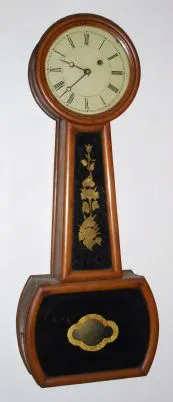 Unsigned Massachusetts banjo clock, weight driven, 8-day, in a bleached mahogany case, C.1840.