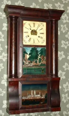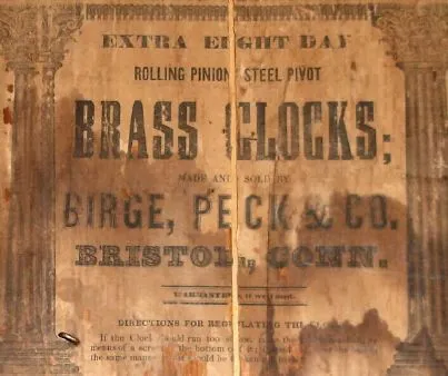 Birge, Peck and Co., Column and Cornice shelf clock, 8-day, 2-wt, time and strike with large strap brass movement. C. 1850. the mahogany veneered case retains its original finish, with some veneer loss confined to the bottom edge. The finish on the columns has flaked some. The original reverse painted tablets with 25% loss. The original painted dial is very good, with some loss at the winding holes and the mounting pins. Hands are original. Someone has added "wings" to the original fan in the strike train. Height 31.5 inches