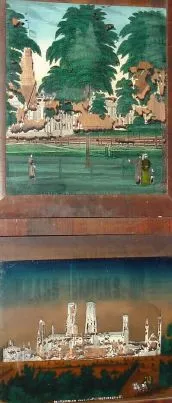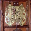 the mahogany veneered case retains its original finish, with some veneer loss confined to the bottom edge. The finish on the columns has flaked some. The original reverse painted tablets with 25% loss. The original painted dial is very good, with some loss at the winding holes and the mounting pins. Hands are original. Someone has added "wings" to the original fan in the strike train. Height 31.5 inches
