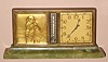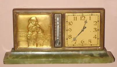 Swiss, Partner's Desk clock (dial on each side), with a calendar on one side and a gilt bronze relief of a sailor in rain gear (she looks female to us), and a thermometer on both sides, the base of green onyx, jeweled movement stem wound from bottom. C.1930 movement is ticking briskly; hands on one side are loose. The day ribbon (flexible brass) is not longer moving, but appears repairable. The onyx has some roughness along top edge and one corner with chip. Overall very good, as-found condition. Width 10.5" Height 5 inches