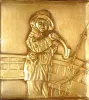 Swiss, Partner's Desk clock (dial on each side), with a calendar on one side and a gilt bronze relief of a sailor in rain gear (she looks female to us), and a thermometer on both sides, the base of green onyx, jeweled movement stem wound from bottom. C