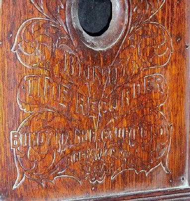Bundy Time Recording Co., Binghampton, NY, type 1-C oak cased clock, WITHOUT lower recording mechanism, C.1898 this clock has been in storage and has not run for years, but is overall sound. There is one small bit of carving missing from the door; otherwise case is complete and with old or original finish (needs cleaning/waxing). Again, lower case is empty. Additional information on Bundy can be found on the internet. Note inside instructions are good except for some loss at top edge. Height 56 inches