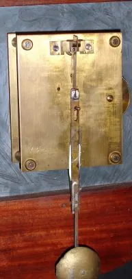 the case is in very clean condition. Retains a very heavy cast brass bezel; note glass is cracked. Heavy metal dial that was originally painted now is now pasted over with a paper dial. Has a heavy Elliott chain fusee movement, signed and with serial No. . Pendulum is a home-made replacement. Height 18 inches