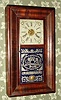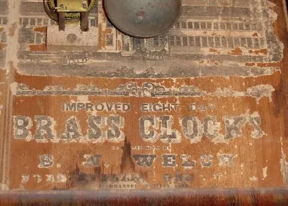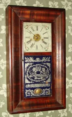 E. N. Welch Mfg. Co., OG shelf clock, time, strike and outboard alarm, 8-day, 2-wt. C. 1865. well figured mahogany case with no veneer loss; has minor deterioration to original finish, small bit of veneer lifting. Orig painted dial has some stains and minor loss at the mounting pins. Hands are original. This clock was likely made for export, as the Lion/Unicorn tablet is original as well. The alarm mech will need some attention as it is bound up. Silver fish have eaten the white portion of the label. Overall very good+ condition. Height 29 inches