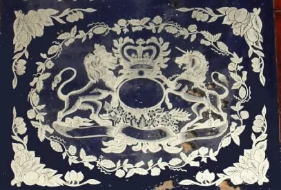 well figured mahogany case with no veneer loss; has minor deterioration to original finish, small bit of veneer lifting. Orig painted dial has some stains and minor loss at the mounting pins. Hands are original. This clock was likely made for export, as the Lion/Unicorn tablet is original as well. The alarm mech will need some attention as it is bound up. Silver fish have eaten the white portion of the label. Overall very good+ condition. Height 29 inches