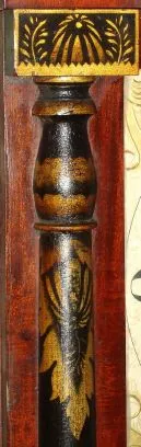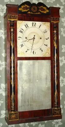 mahogany veneered case has old finish with repair to the base. Top splat and chimneys are replacements. Columns are original and leafy stenciling has been carefully cleaned. Repairs on left side case where hinges mount. Clean label inside case. Height 35.5 inches