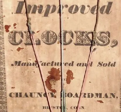 Chauncey Boardman, Bristol, Conn, stenciled half column and splat shelf clock, 30-hour time and strike wood movement, "groaner". C.1830.