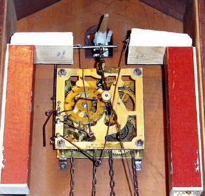 this clock came from Blue Ball and has not run for many years. The case has several dry splits. Original bellows and flutes are intact, bellows just starting to leak a little. The movement is a transitional one, still heavy lyre plates, but are stamped as is the count-wheel. Wooden cuckoo with wired wings and beak. Despite movement being dry, it still ticks and cucks. Wts do not match. Ht from pendulum to wing tip = 24.5"