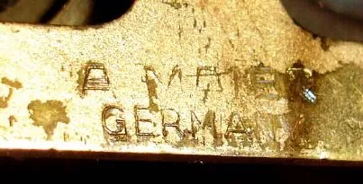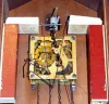 German, A. Maier, larger 5-leaf and single bird cuckoo, 1-day, 2-weight cuckoo strike, C.1930 this clock came from Blue Ball and has not run for many years. The case has several dry splits. Original bellows and flutes are intact, bellows just starting to leak a little. The movement is a transitional one, still heavy lyre plates, but are stamped as is the count-wheel. Wooden cuckoo with wired wings and beak. Despite movement being dry, it still ticks and cucks. Wts do not match. Ht from pendulum to wing tip = 24.5"
