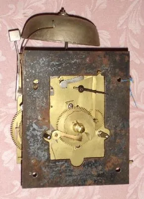 this is a clean, complete movement with a pleasant sounding bell. The fork for the crutch wire got broken off and is wired to the movement (blue wire in foto). There is a tension spring on the false plate to index a moon dial, however no pawl to advance such a dial (will function fine without this feature) Height 7 inches