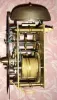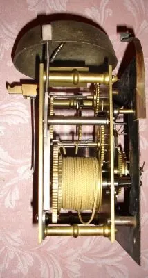 English, 2-train tall clock movement with rack striking on a bell, brass, 8-day C.1850. this is a clean, complete movement with a pleasant sounding bell. The fork for the crutch wire got broken off and is wired to the movement (blue wire in foto). There is a tension spring on the false plate to index a moon dial, however no pawl to advance such a dial (will function fine without this feature) Height 7 inches