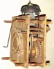 Box of 4 movements: mixed lot of two Terry type 30-hour wood shelf clock movements, French 8-day movement and dial and an Ashby type 30-hour tall clock movement. One of the shelf clock movements is missing the second wheel in the strike train and a verge. The other movement has a broken great wheel in the strike train. French movement is missing the strike hammer, however is otherwise complete and with nice porcelain dial and orig gilt hands. Ashby tall clock movement is complete, except for the intermediate wheel for the calendar and the two brass inserts that support the verge.