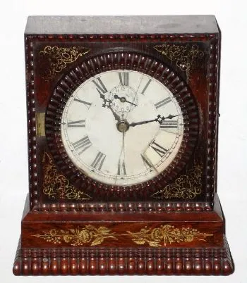 Ripple molding rosewood veneered clock case. This case probably had a small lever timepiece movement by Forestville/ J.C. Brown, but now with a battery movement and hands. C.1850. Rosewood veneered case in an original finish with most of the gold decoration intact. Dial is from an alarm clock. Glass is cracked. When complete and original, we have sold this model for over $2000. Height 8.25 inches