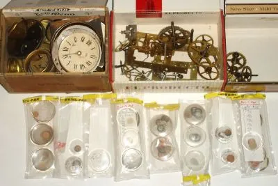 Box lot, best part of which is a carefully inventoried lot of 6-dozen new bulls eye watch crystals, glass, in various sizes, other items include a clock movement in pieces, minus its springs, and another large cigar box of dial plates and small novelty