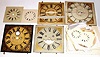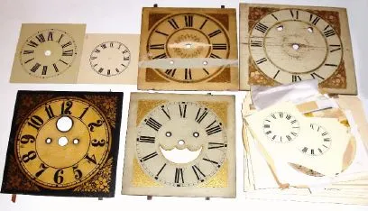Box lot including a large assortment of modern paper dials and eight antique wooden dials in various states.