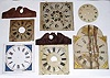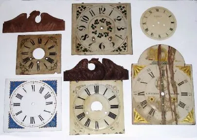 Box lot of 15 wooden dials in various conditions. Two modern eagle splats for wooden movement shelf clocks. A modern striking banjo dial, 1 modern replacement glass for an OG or column clock. Period metal dial. ST tall clock dial, distressed but restorable. Only few shown in foto.