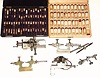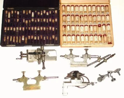 Box lot consisting of: a case with an assortment of white and yellow GF jump rings. A case with about 72 small corked glass vials, only 5 with small watch screws and other assorted small parts. Finally a box with 3 lathe attachments for pivot polishing, very nicely made and a demagnetizer