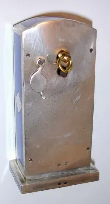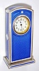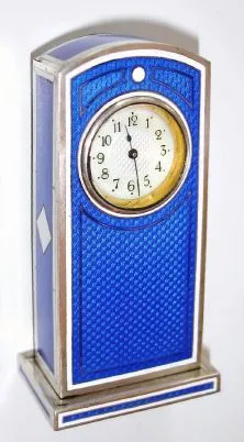 Swiss, miniature mantel clock, Royal Blue guilloche enamel over hallmarked silver, and with contrasting white strips and a white diamond shaped inset on each side, with rear wind and set lever movement, C.1935 Condition: overall excellent original condition Height 3.6 inches