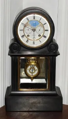 French, Black marble mantel clock with day and date calendar plus moon-phases on the dial, pat A. Brocot and Dellettrez, signed on movement and dial below 6, C.1890