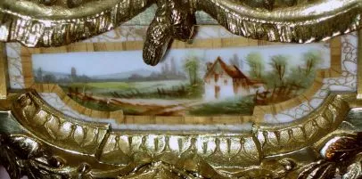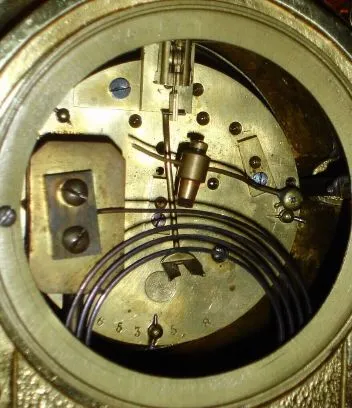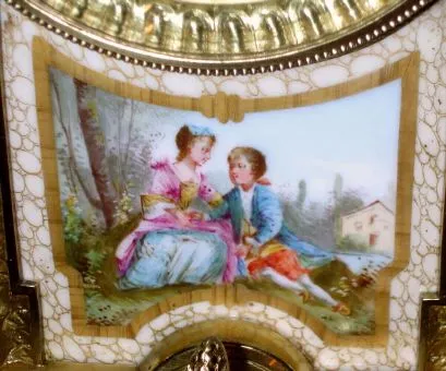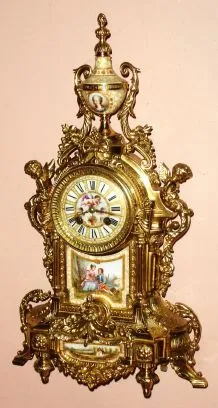 French, S. Marti and Cie, for J. E. Caldwell, Philadelphia, an architectural fantasy with swags, female caryatids and flower adornments, all in cast brass, now polished, and with a porcelain panel dial showing a winged cherub, a plaque below the dial showing a pair of lovers and a ladies' bust on the porcelain urn at top, 8-day time and strike, spring movement. C.1900 the brass case has been polished and lacquered; porcelain bits are in very good condition, and the movement has been cleaned and is running. Note that the rear side of this case is also well finished, uncommon on this style of clock. Height 19 inches