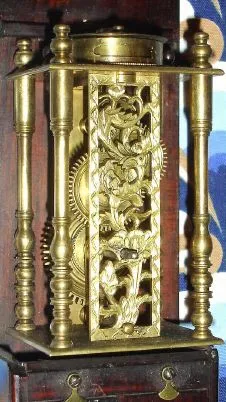 Japan, Meiji period, Shitan wood pillar clock, time only, weight driven, skeletonized front plate, and with duplex scales, the left side with a fixed scale European system 24 equal hours and with half hour markings also, and the right with movable