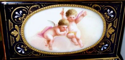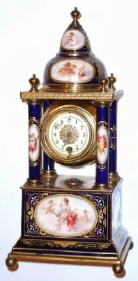 Austrian, Royal Vienna, portico clock with small 8-day timepiece, in a blue cobalt case with hand painted cameos of ladies and cherubs, C.1890 24k gold highlights are still sharp and bright with only minor wear; there is a small dial repair on the porcelain dial at 6; otherwise in excellent original condition. Height 14 inches
