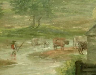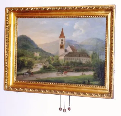 Austrian, Grand Sonnerie Picture clock, pull wind, and the dial for the clock showing on the church tower in the painting. The scene typical of an Alpine village in southern Austria, and with 9 total people in various activities, tending cows, in carriage, carrying freight. C.1840. overall very good original condition, the oil on wood painting with some cracks and minor touch up. There is a lever on the right side of the clock for starting the pendulum if it has wound down. This ran 2 days here, and may go for 3, however typically these are 2 day clocks. The wooden slide out cover for the rear is original. Pull 3 large strings at bottom for winding, the 4th if for full quarter repeating. Width = 34" ht = 25"