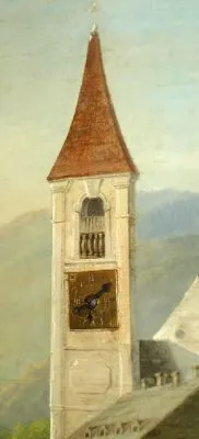 Austrian, Grand Sonnerie Picture clock, pull wind, and the dial for the clock showing on the church tower in the painting. The scene typical of an Alpine village in southern Austria, and with 9 total people in various activities, tending cows, in carriage