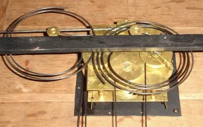 overall very good original condition, the oil on wood painting with some cracks and minor touch up. There is a lever on the right side of the clock for starting the pendulum if it has wound down. This ran 2 days here, and may go for 3, however typically these are 2 day clocks. The wooden slide out cover for the rear is original. Pull 3 large strings at bottom for winding, the 4th if for full quarter repeating. Width = 34" ht = 25"