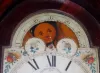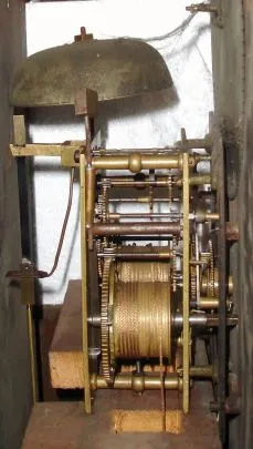 the mixed wood veneers on the case have some loose spots and repairs, and the broken arch top has both tips cut off (missing), and feet are lacking. Seconds hand is missing; tip to hour hand is broken away; dial has for some reason been double drilled and has a set of filled holes in the calendar area (note dial does fit this movement well), various small chips in dial. Note cob webs on movement; it has not run in a long while. Seatboard is replaced. Height 81 inches