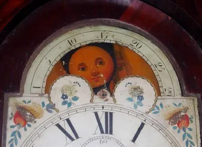 English, Yorkshire area tall clock, wide case with short door, and with 20" rolling moon dial, 2-wt, 8-day, C.1840 the mixed wood veneers on the case have some loose spots and repairs, and the broken arch top has both tips cut off (missing), and feet are lacking. Seconds hand is missing; tip to hour hand is broken away; dial has for some reason been double drilled and has a set of filled holes in the calendar area (note dial does fit this movement well), various small chips in dial. Note cob webs on movement; it has not run in a long while. Seatboard is replaced. Height 81 inches