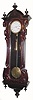 the case has some deteriorated finish on the section above the door and a replaced "keystone" to the top that is finished a little roughly. The movement retains its original dial plate and bezel, but the dial itself has been nicely replace by a good craftsman, with slender numerals fired into the porcelain. Function as follows: while the main barrel is unwinding during operation, a siamesed barrel is turning as well, thus winding up a dangling cord out the right side of the case. When the week is up, one pulls the external cord and the process is reversed. Height 55 inches