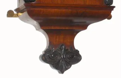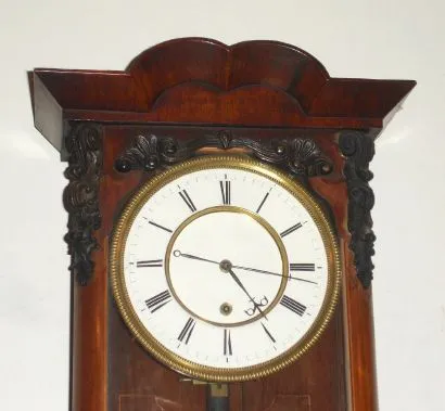 Austrian, late Biedermeier timepiece, 30-day 1-weight, maintaining power, in a rosewood case with dark gesso accents, less top trim. C. 1855. the weight and pulley are Victorian, can be replaced, and top trim lacking. The period movement fits the clock well, but small holes in the case back indicate it is not original to the case. Has good 2-pc brass pendulum, early beat scale, nice original hands, OK dial (small repair at 9), and winding grommet intact. Also case stabilizers still present. This clock most closely resembles a Vienna Regulator pictured in Ortenburger's book "Vienna Regulators and Factory Clocks" (1990), pg 79, left. Height 41 inches