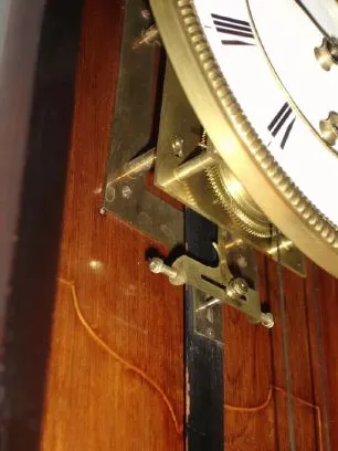 the weight and pulley are Victorian, can be replaced, and top trim lacking. The period movement fits the clock well, but small holes in the case back indicate it is not original to the case. Has good 2-pc brass pendulum, early beat scale, nice original hands, OK dial (small repair at 9), and winding grommet intact. Also case stabilizers still present. This clock most closely resembles a Vienna Regulator pictured in Ortenburger's book "Vienna Regulators and Factory Clocks" (1990), pg 79, left. Height 41 inches