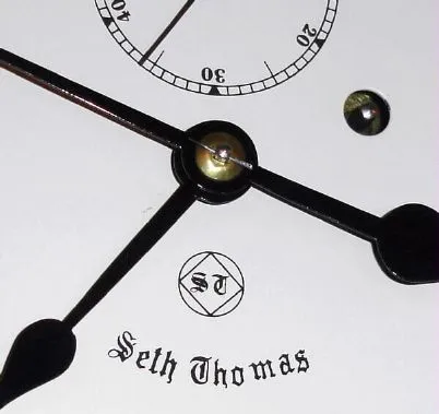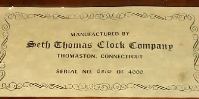 Virtually like new. This model was re-issued by Seth Thomas in the 1970's and this one has received good care over the years. The movement carries the Seth Thomas logo, and also the serial No. 310 (number is on inside label also). Dial, hands, weight and pendulum are original. Runs briskly. Height 49 inches