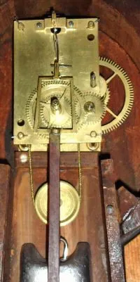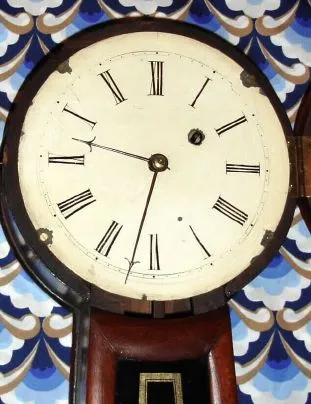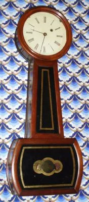 A Massachusetts Banjo timepiece, in a mahogany case, the movement perhaps a bit earlier, wheels with very long teeth, and designed for fillister screw attachment, now attached with a center rear screw, note period "barb" hands. C.1850