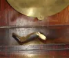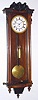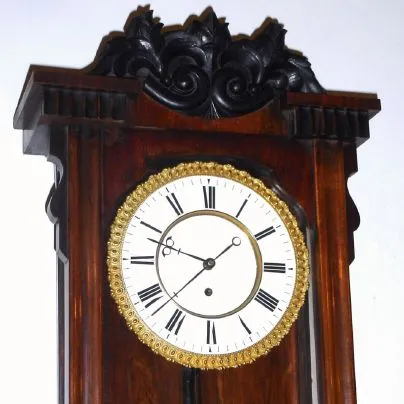 bottom 3 finials are replacements and not the proper design. A 3" portion of molding is absent from bottom. Grommet for winding hole is absent. Engraved weight is later. Otherwise this is a good old Vienna with nice rosewood veneer on the back and with what appears to be the original carved top, and good hand-made movement. There are no extra holes in the back at the mounting brkt. Hands, cast bezel and 2-pc brass pendulum are all original. Height 41 inches